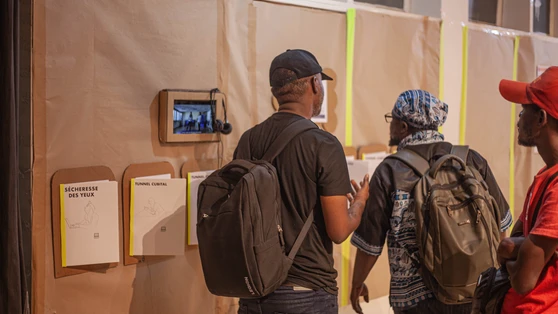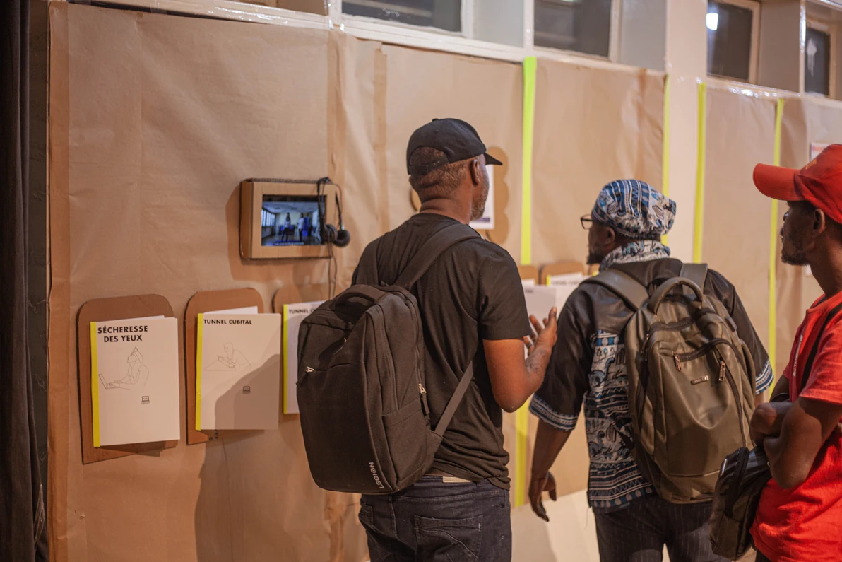 L’exposition ESCAPE – Générations numériques a constitué le cœur du programme. À Kinshasa, le co-commissaire Éric Boulo a mené un travail de terrain auprès de quinze étudiants de l’Académie des Beaux-Arts, en les accompagnant pendant une semaine dans la conception et la réalisation de la scénographie ainsi que dans la médiation auprès du public.